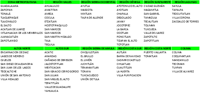 13. La dinámica es exclusiva para los estados de Jalisco y Colima, en los siguientes municipios: