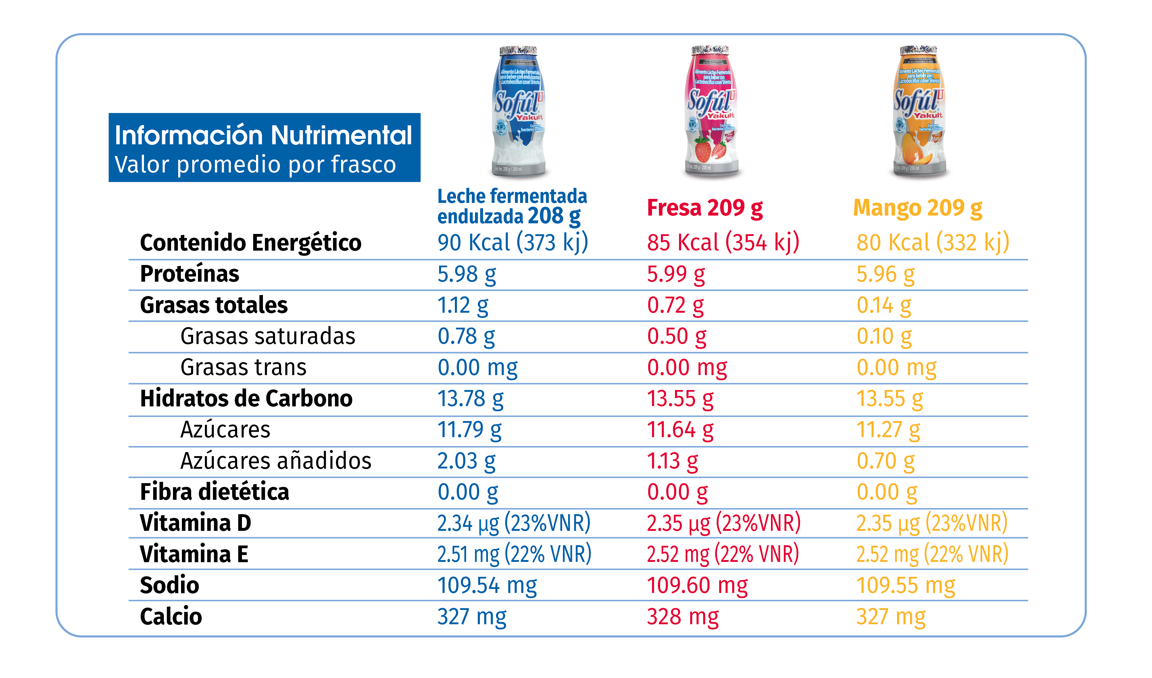 Sofúl LT para beber es un alimento lácteo fermentado reducido en calorías, que al estar elaborado con leche aporta calcio y proteínas, además contiene vitamina D y E.